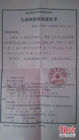 死者家属提供的关于马振社的行政拘留家属通知书上显示,该通知书的文号为“南岗公(和兴)行拘通字【2015】544号。该通知书称,马振社因扰乱公共秩序,于6月4日被决定行政拘留十日。执行场所为哈尔滨拘留所。