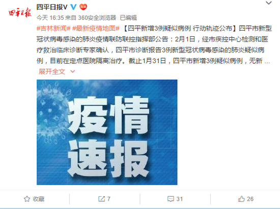 四平新增3例疑似病例 行动轨迹发布