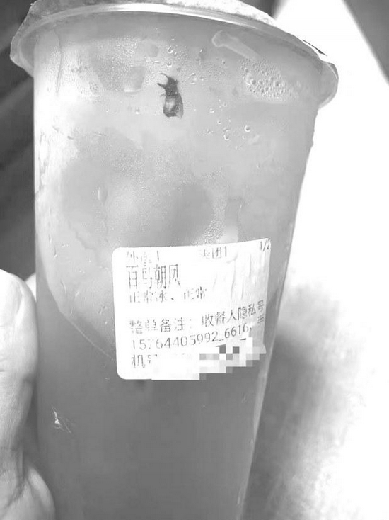 8月17日,有网友在微博爆料,自己在长春净月区某奶茶店购买了两杯名为“百鸟朝凤”的冷饮,结果喝了两口后,突然发现杯子里有一只苍蝇!