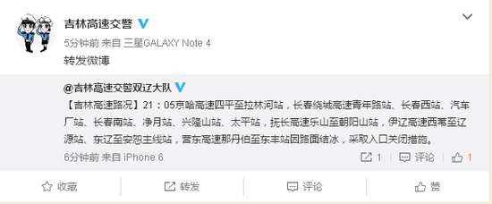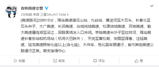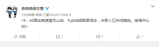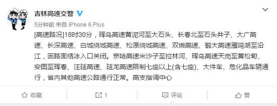 [高速路况]19:40珲乌高速莲花山站、九台站因路面结冰,采取入口关闭措施。指调中心001