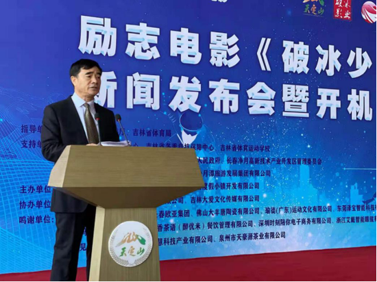 吉林省建设集团董事长江礼成在《破冰少年》新闻发布会暨开机仪式现场致辞。他表示,吉林省地处冰雪黄金纬度带,是电影《破冰少年》取景拍摄的绝佳场地。天定山将大力配合本次电影的拍摄,同时继续以冬奥会为契机,大力普及群众性冰雪运动,让更多的人爱上冰雪运动,爱上滑雪。