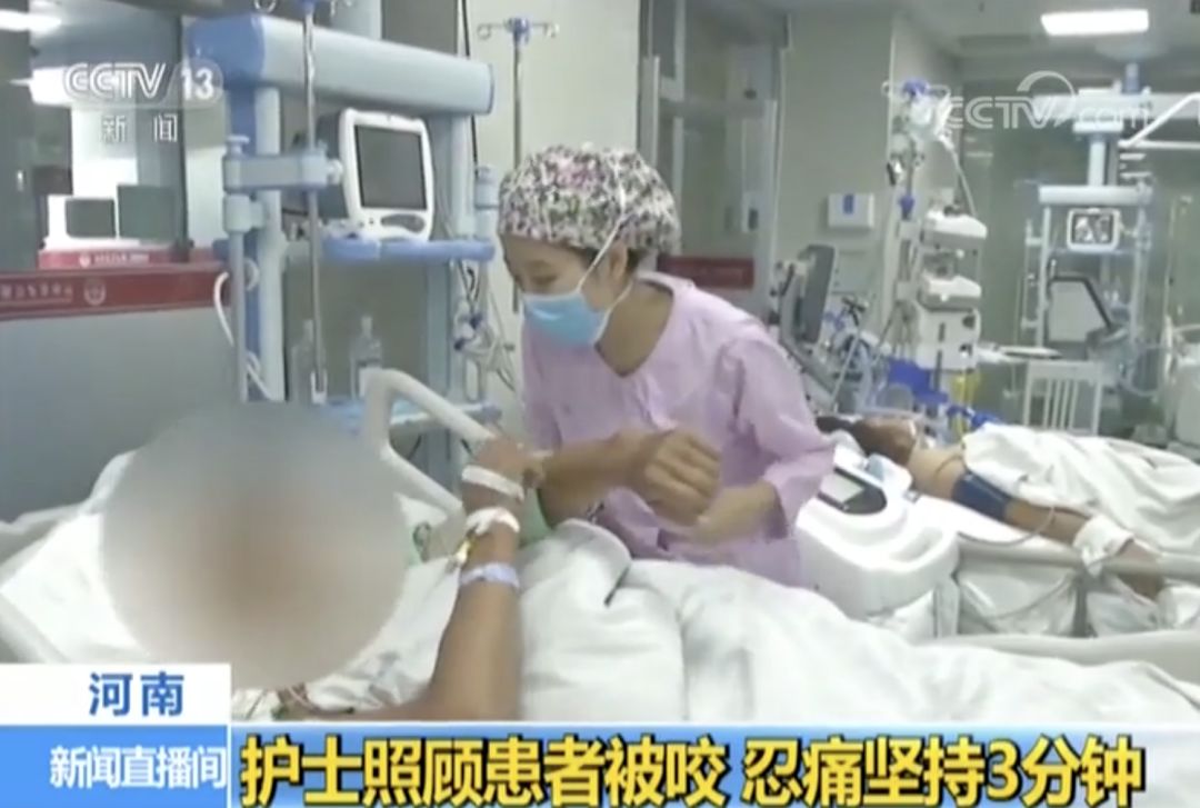 近日,在河南新乡市医学院第一附属医院的急诊监护室内,护士刘珊在照料重伤病患时,手臂突然被患者咬住。