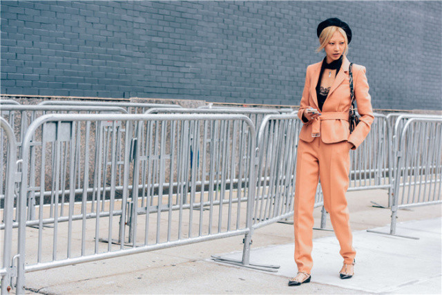 最省事的搭配,西装成套穿。内搭T恤,穿上外套,OFFICE LADY;脱下外套,甚至系在腰间,随时可以跳街舞的节奏。