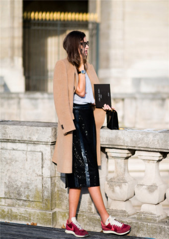 最流行的T恤加铅笔裙,有时真的会冷,披一件驼色的长款大衣,你也看起来靠谱多啦!