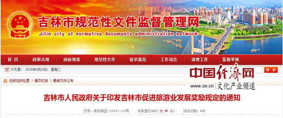 中国经济网北京6月16日讯(记者 张晶雪) 中国经济网文化产业频道记者获悉,吉林市政府近日印发了《吉林市促进旅游业发展奖励规定》(以下简称《规定》),对扶持项目、奖励政策做出详细的规定。 >>>更多政策可查看中国经济网“中国文化产业政策库”