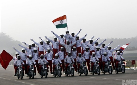 当地时间2015年1月26日,印度新德里,印度举行阅兵式庆祝共和国日。图为印度士兵展示摩托车特技。