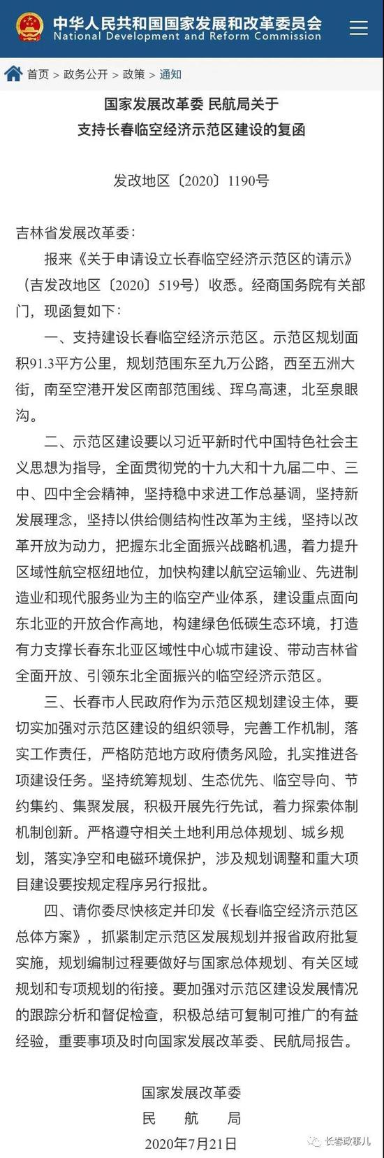 国家发展改革委、民航局支持长春临空经济示范区建设