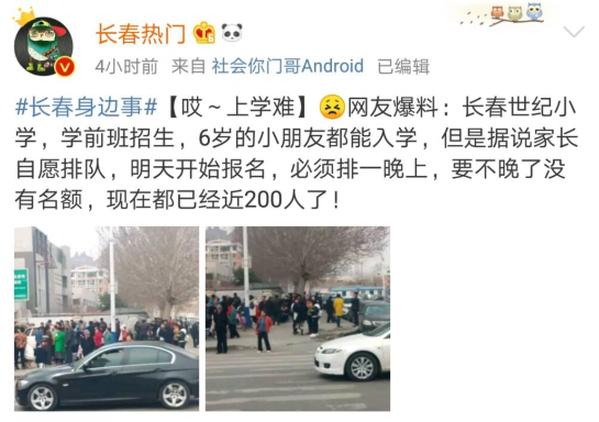 4月1日傍晚,知名微博博主“长春热门”爆料:长春世纪小学学前班招生,6岁的小朋友都能入学,但是据说家长自愿排队,明天开始报名,必须排一晚上,要不晚了没有名额,现在都已经近200人了!