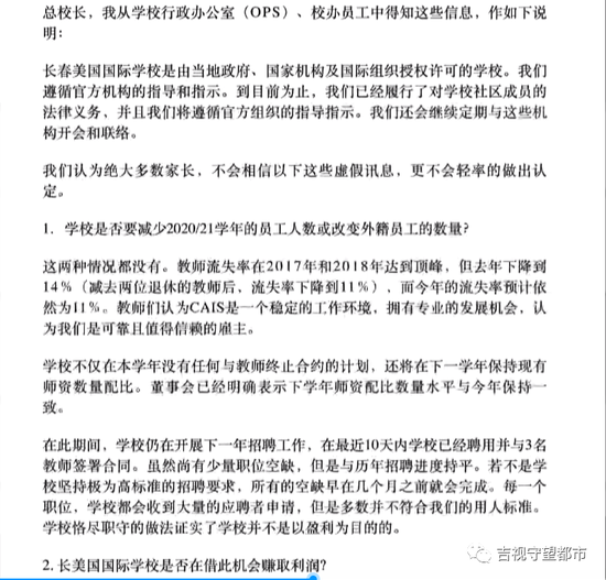 长春美国国际学校代表:”第一请各位家长认真阅读昨天我们发出的信息,通过正规的渠道和学校进行沟通;第二家长代表可以和我们或是校办进行预约,然后我们会在下周帮助家长代表和校长进行会面,来解决相应的问题。“