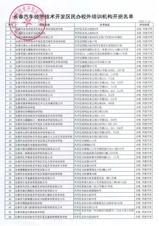 7月13日,长春市绿园区教育局和长春汽车经济技术开发区管理委员会官网分别刊登公告,按照《长春市教育局印发关于做好校外培训机构有序恢复线下课程的指导意见的通知》要求,两个区共有67所校外培训机构符合开学复课条件,允许开学复课。