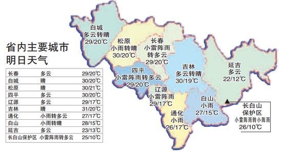 今天,白城、松原、长春、四平、辽源、吉林地区南部、通化、白山、延边地区西部、长白山保护区有小阵雨或小雷阵雨,其中辽源、吉林地区南部、通化、白山、长白山保护区局部地方有中到大雨,并伴有短时强降水、雷雨大风或冰雹等强对流天气。 小伙伴,做好预防哈。