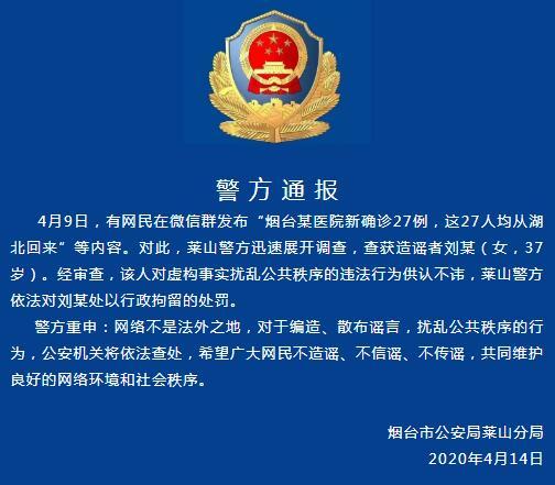4月14日电 山东烟台市公安局莱山分局14日在微信公众号发布通报称,4月9日,有网民在微信群发布“烟台某医院新确诊27例,这27人均从湖北回来”等内容。对此,莱山警方迅速展开调查,查获造谣者刘某(女,37岁)。