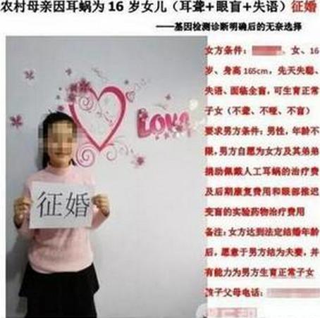 替16岁女儿征婚,目的是为失聪儿子筹集医药费,未经女儿同意妈妈违背婚姻法。最近,不少天津市民在朋友圈看到了一则名为《农村母亲为16岁女儿(耳聋+眼盲+失语)征婚》的求助信息。是什么原因让这位母亲做出了这样的选择?记者对此进行了采访。