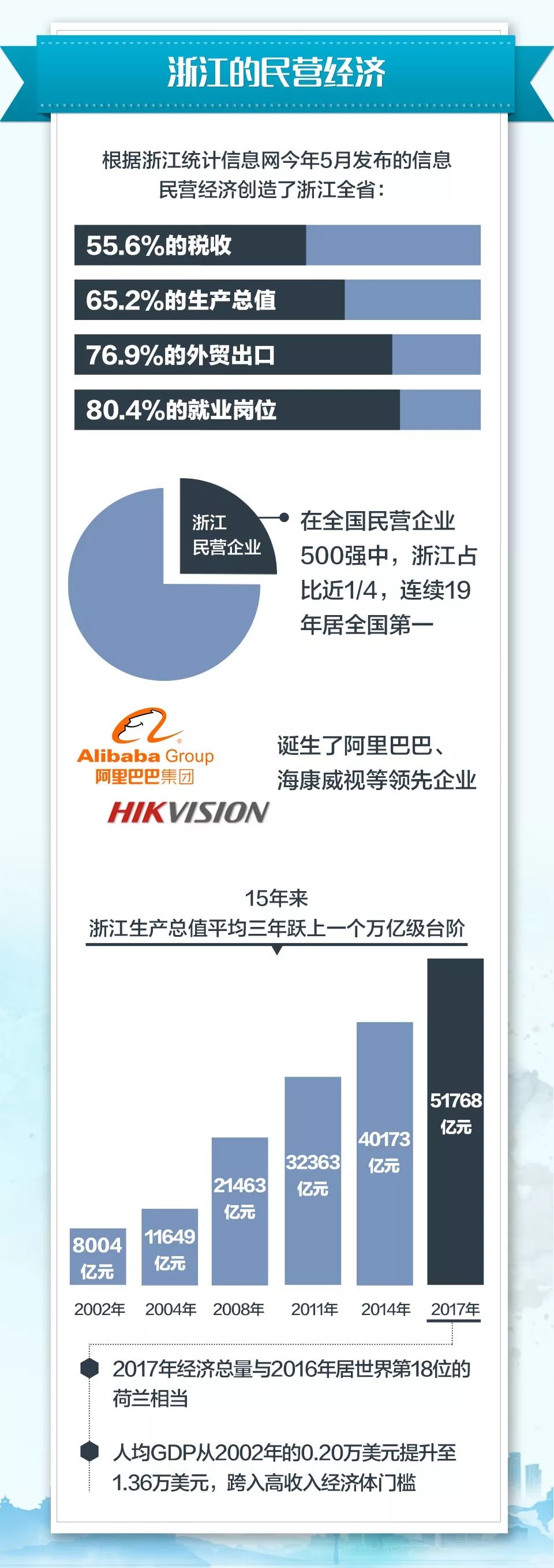 民营经济是浙江经济的最大特色和优势。习近平同志主政浙江期间,始终坚持“两个毫不动摇”(毫不动摇巩固和发展公有制经济,毫不动摇鼓励、支持、引导非公有制经济发展),在发展公有经济的同时,积极鼓励民营经济发展与转型。