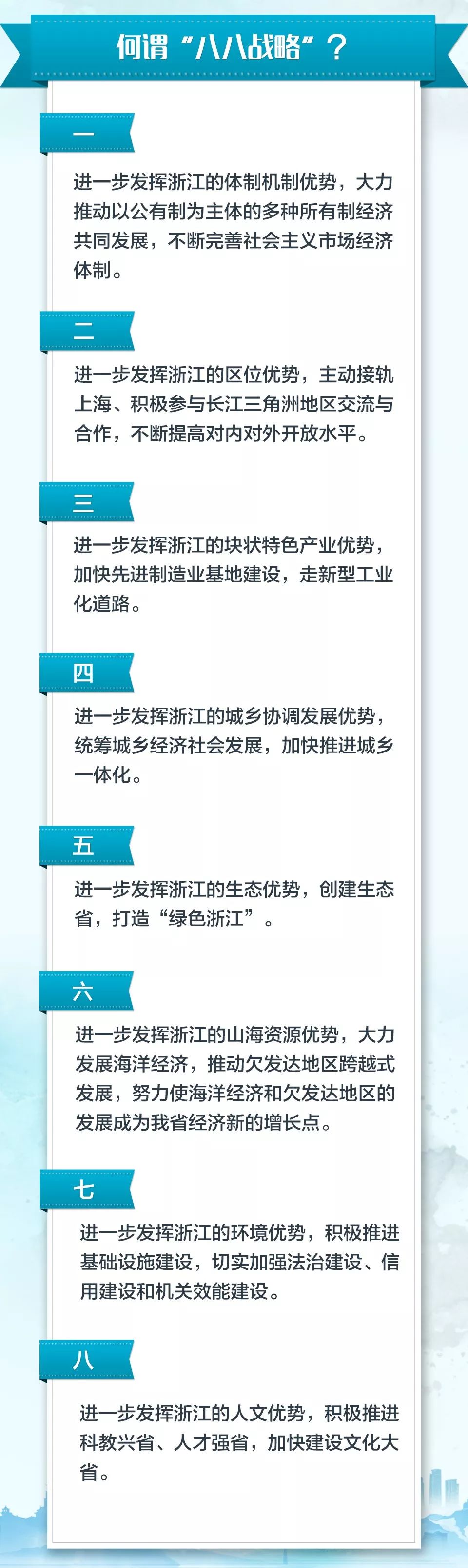 2003年7月,中共浙江省委举行第十一届四次全体(扩大)会议,时任浙江省委书记习近平作工作报告,提出浙江面向未来发展的系统方案:即进一步发挥“八个方面的优势”,推进“八个方面的举措”,简称“八八战略”。