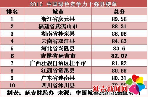 延吉荣膺2015中国绿色竞争力十强县 位居第六