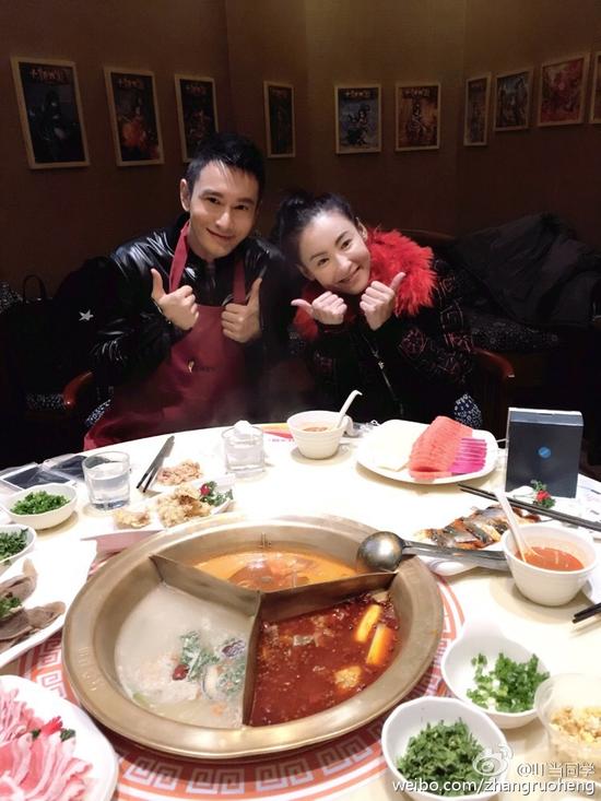 照片中,桌上有着冒着热气的诱人火锅,黄晓明和张柏芝挨坐在一起,两人同时竖起大拇指卖萌,并露出开心的笑容。随后,张柏芝工作人员“叮当同学”也在微博中晒图并透露称:“柏芝晓明相聚!多谢晓明哥款待!好吃极啦!2016你们俩都棒棒哒!”