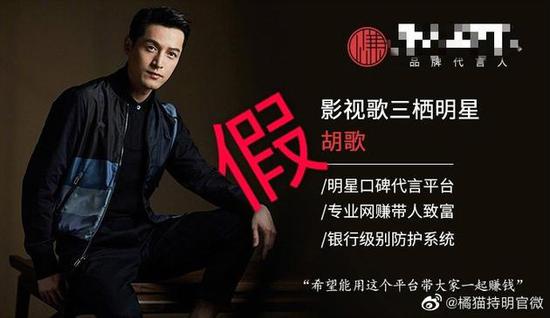 近日,一团队在社交平台发文称与胡歌达成合作,成为其团队的形象代言人。该团队还以胡歌的口吻发文称自己是网赚的受益者,希望帮助更多有梦想却还没有能力去实现的人。3月2日,胡歌方就此事通过微博打假,否认与该团队有过任何合作,从未担任该团队代言人。“我方已经就此侵权行为取证调查,保留进一步追究法律责任的权利!特此声明!”