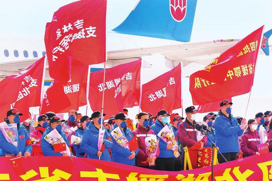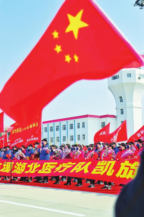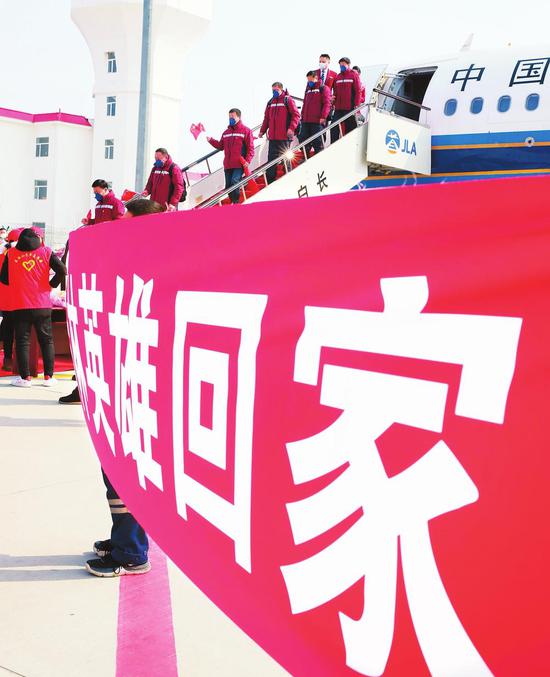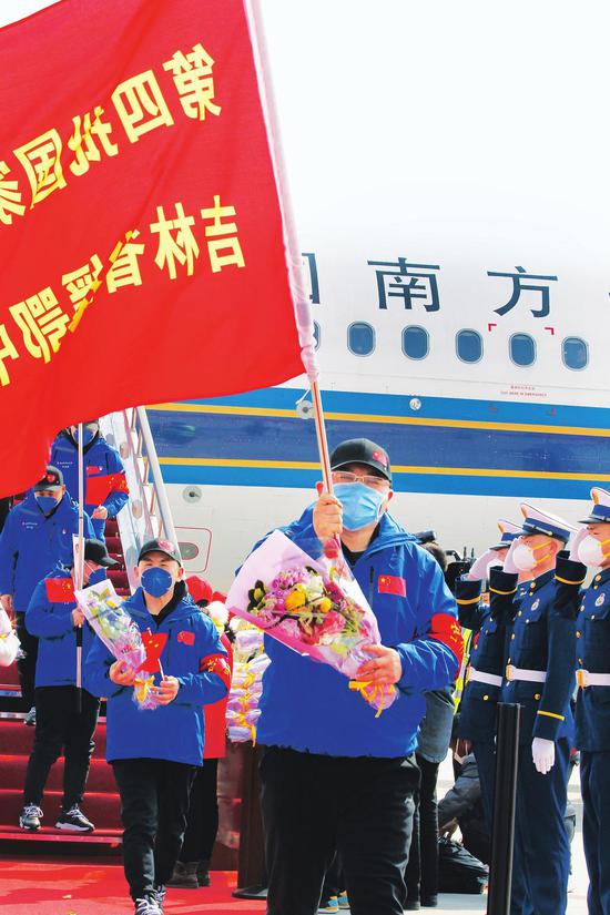 3月31日下午,在圆满完成医疗救治任务后,吉林省支援湖北第五批返吉人员平安凯旋。 照片分别为记者 付平 丁研 张明月 王佳琪 摄(来源:吉林日报 记者:张雅静 张鹤)