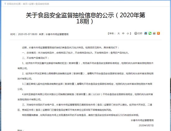 三、对抽检中发现的不合格产品,长春市市场监督管理局已通报各地市场(食品)监管部门依法予以查处。经济技术开发区、二道区、宽城区市场(食品)监管部门已督促食品经营环节有关单位立即采取下架等措施控制风险。