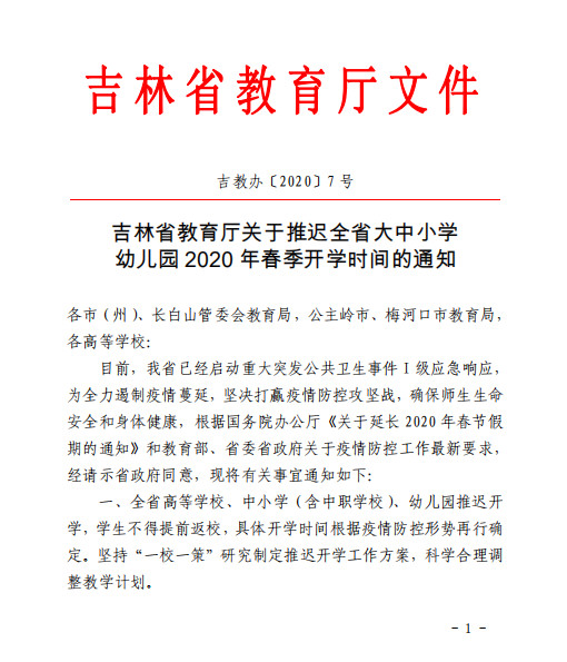 吉林省教育厅:推迟全省大中小学幼儿园2020年春季开学时间