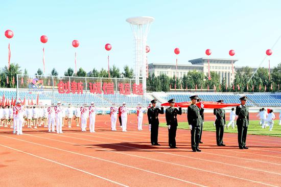 威武列阵,战旗飘飘。30支代表队在五星红旗的引领下,高举“创新、诚信、超越”的长春新区精神标语,披着金秋的霞光依次入场,雄壮嘹亮的口号喊出了激情豪迈的心声。全场掌声雷动、锣鼓喧天,共同庆祝长春新区第二届运动会隆重召开。入场式后,全场起立,高唱中华人民共和国国歌。鲜艳的五星红旗冉冉升起,在阳光下熠熠生辉。
