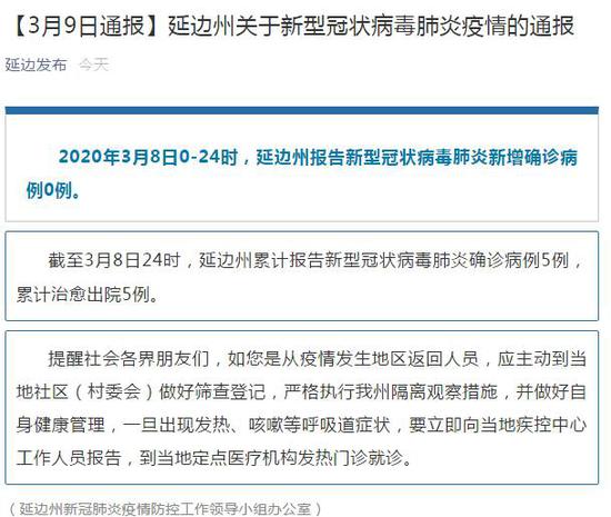 截至3月8日24时,延边州累计报告新型冠状病毒肺炎确诊病例5例,累计治愈出院5例。