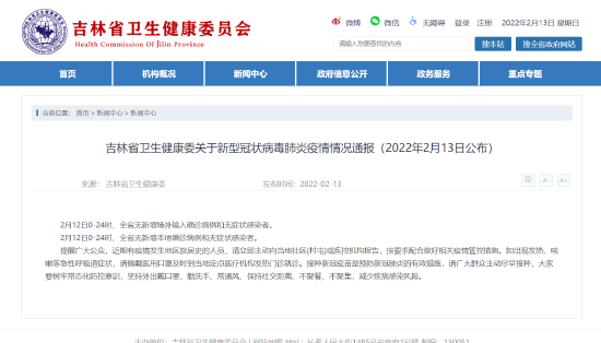 2月12日吉林省无新增本地确诊病例和无症状感染者