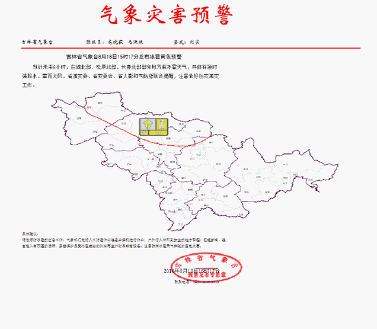 吉林省气象台8月18日15时17分发布冰雹黄色预警:预计未来6小时,白城北部、松原北部、长春北部部分地方有冰雹天气,并伴有短时强降水、雷雨大风,省减灾委、省安委会、省人影和气防指联合提醒,注意做好防灾减灾工作。