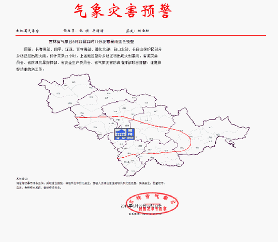 吉林省气象台6月22日22时11分发布暴雨蓝色预警:目前,长春南部、四平、辽源、吉林南部、通化北部、白山北部、长白山保护区部分乡镇已经出现大雨,预计未来24小时,上述地区部分乡镇还将出现大到暴雨,省减灾委员会、省防汛抗旱指挥部、省安全生产委员会、省气象灾害防御指挥部联合提醒:注意做好防汛抗洪工作。