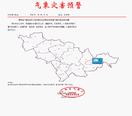吉林省气象台13日发布洪涝灾害气象风险蓝色预警