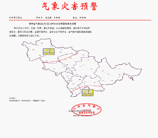 吉林省气象台6月7日16时30分发布雷电黄色预警:预计未来12小时,白城、松原、通化东南部、白山南部有雷电,部分地方伴有短时强降水、雷雨大风或冰雹,省减灾委员会、省安全生产委员会、省气象灾害防御指挥部联合提醒,注意做好防灾减灾工作。