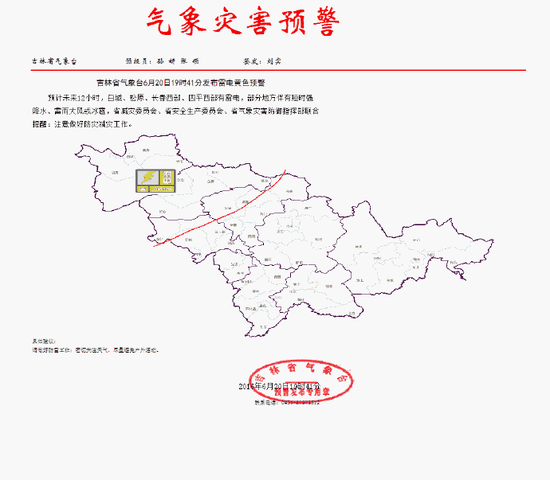 吉林省气象台6月20日19时41分发布雷电黄色预警: 预计未来12小时,白城、松原、长春西部、四平西部有雷电,部分地方伴有短时强降水、雷雨大风或冰雹,省减灾委员会、省安全生产委员会、省气象灾害防御指挥部联合提醒:注意做好防灾减灾工作。