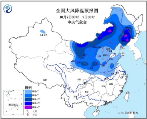 中央气象台10月7日06时继续发布大风降温预报:未来两天,受一股较强冷空气影响,西北地区东部、内蒙古、华北、黄淮大部、东北地区大部、江汉北部、江淮北部等地将先后有4~6级偏北风,阵风风力可达到7~8级,气温随之下降6~10℃,其中,内蒙古中西部、甘肃东部、陕西中部、东北地区中南部等地的局部地区降温可达10~14℃;南疆盆地、内蒙古西部、甘肃河西走廊等地局地有浮尘或扬沙天气。