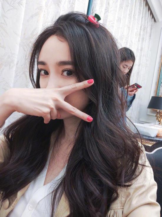 杨幂工作室发自拍福利 头发卷曲蓬松比招牌剪刀手
