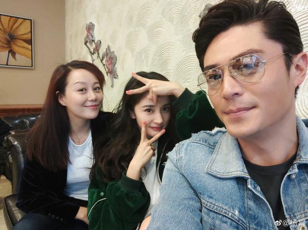 杨幂晒与霍建华合影宣传新剧 双手比耶少女感依旧
