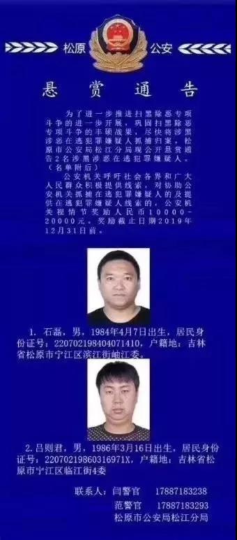 近日,松原市公安局松江分局公开悬赏捉拿2名涉黑涉恶在逃犯罪嫌疑人。