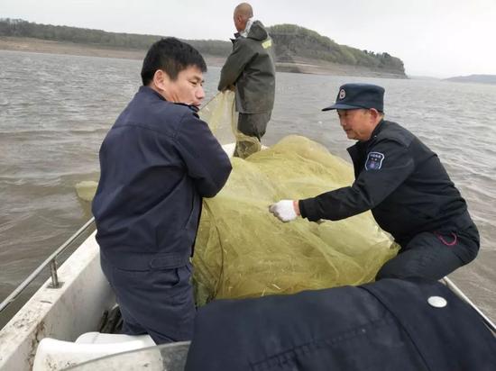 图为5月14日,渔政执法人员在小蛟河水域清理非法捕捞渔网。