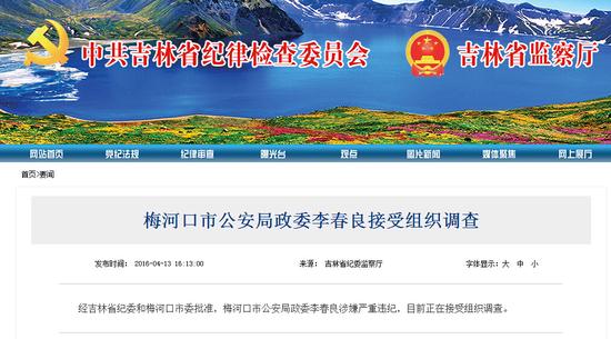 经吉林省纪委和梅河口市委批准,梅河口市公安局政委李春良涉嫌严重违纪,目前正在接受组织调查。