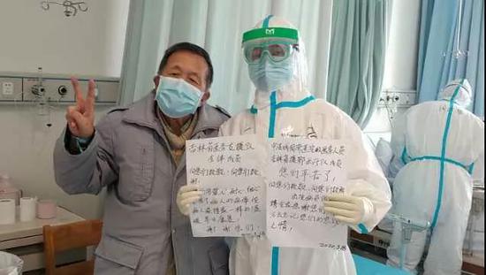 病房里,陈大爷和于婷婷合影留念,虽然已经是八旬老人,比出“剪刀手”的动作特别可爱。陈大爷仔细地记下了于婷婷的电话号码,表示出院后会让家人和她联系,他说:“我要听到你平安回到家乡的消息。”