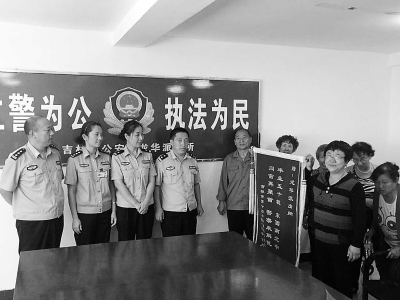 9月9日上午,班长带着六七名老同学来到派出所,向热心帮忙的民警献上锦旗和感谢信。