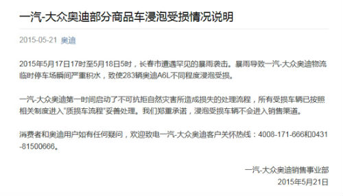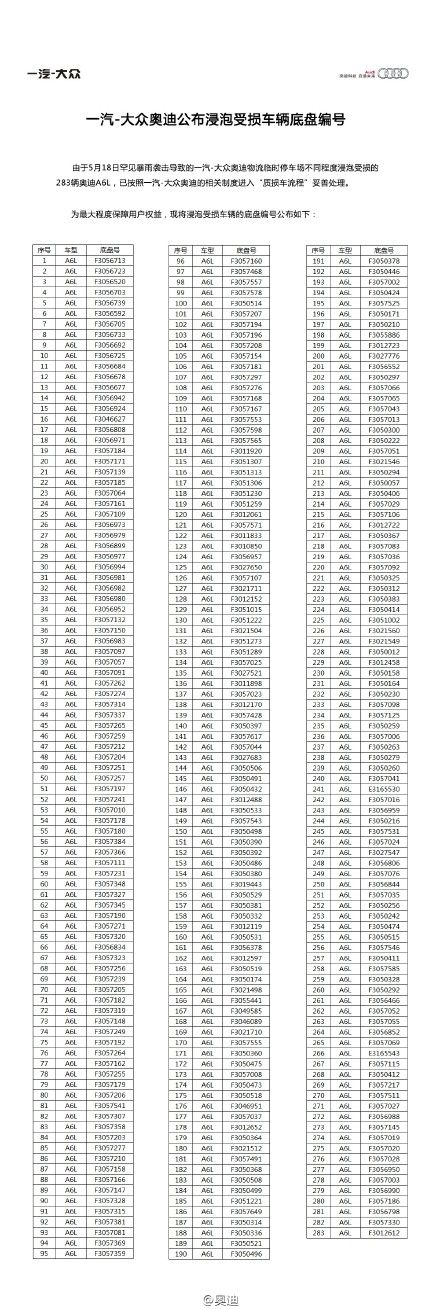 一汽-大众奥迪公布遭暴雨浸泡受损车辆底盘编号