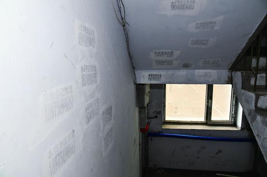 5月20日,记者来到电建小区,发现楼道内纸质的“野广告”已经基本被清除干净,但楼梯、墙上、窗玻璃上还满是黑色油印广告的痕迹。能看得出来,这些油印广告被覆盖过,但效果并不好。