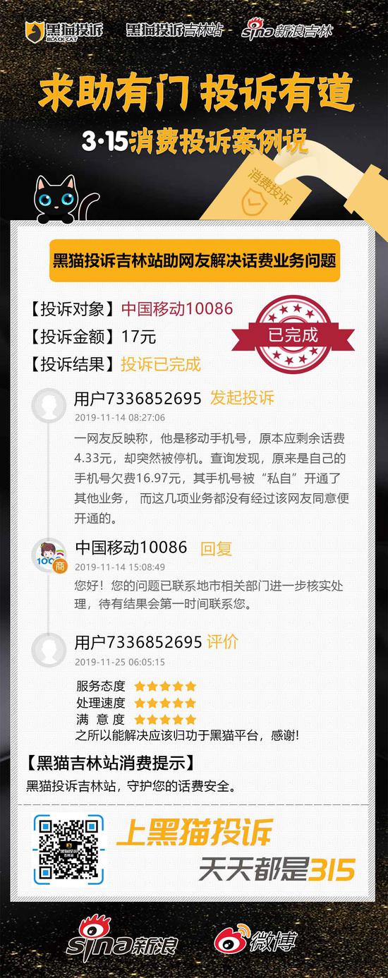黑猫投诉吉林站帮助网友解决话费业务问题