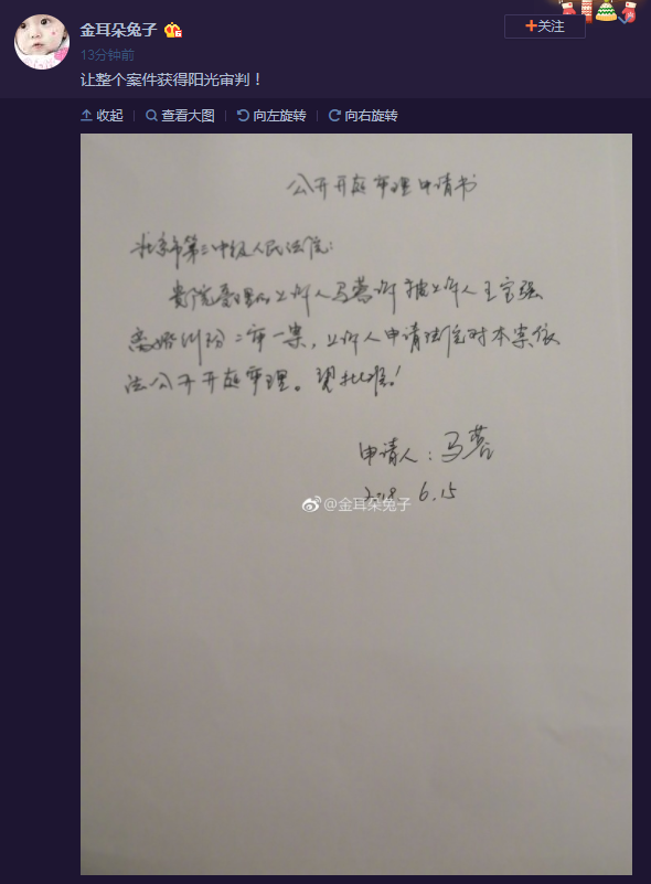 15日,王宝强马蓉离婚案进行二审,马蓉在微博晒出离婚案公开开庭审理申请书,并配文“让整个案件获得阳光审判!”早前,马蓉已抵达北京第三中级人民法院出庭离婚案二审。据悉,此前王宝强也曾提交申请二审公开,主要理由是,因马蓉在审理过程中以及两案一审民事判决作出后,多次在媒体等公开场合发布与案件相关的信息,并且两案证据基本相同,经媒体报道已经基本被公众知悉,因此已经不存在因涉及个人隐私而不公开审理的情形。