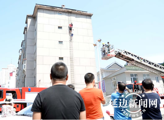 6月28日,在延吉西市场过渡经营场所大千城对面一家银行后侧的居民楼上,一名男子站在楼体外梯上,离地面约有五层楼的高度,精神恍惚,情绪激动,欲跳楼轻生。