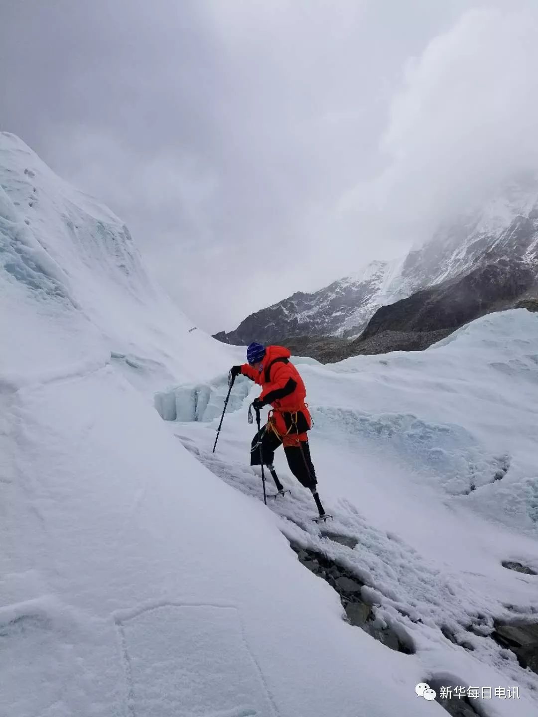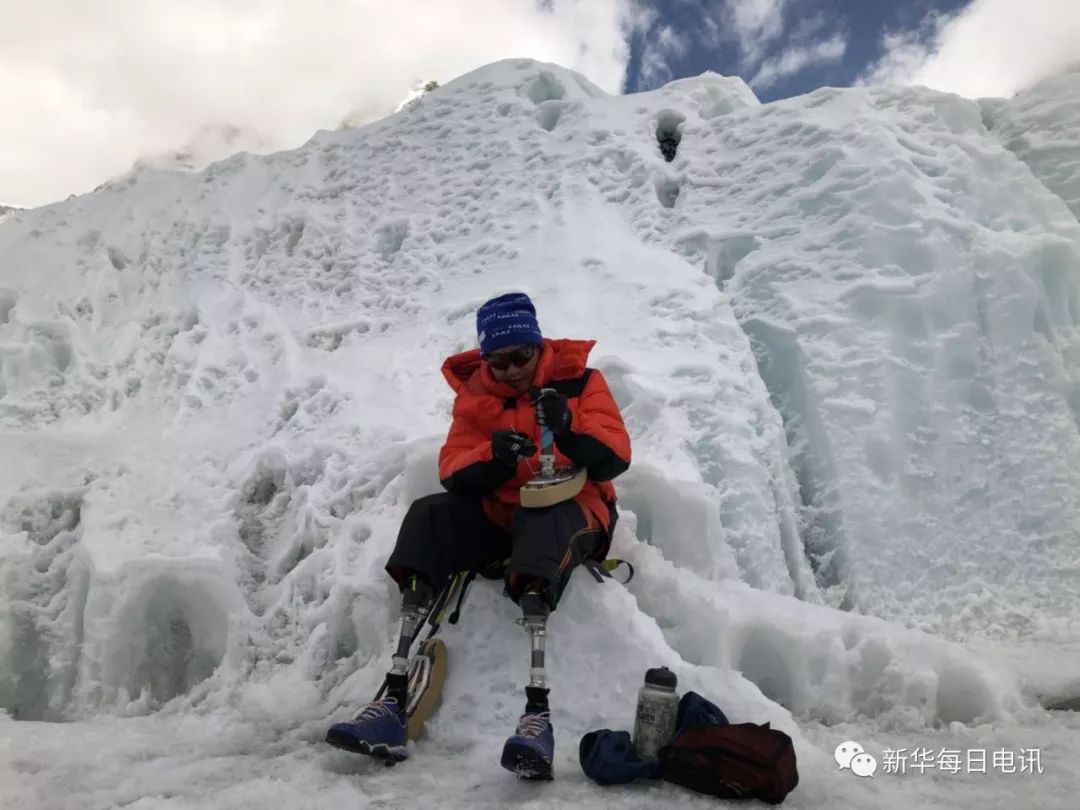 他拄着两根登山杖,努力用钛合金材质的义肢多走了几步,想到山的边缘看看。他通过对讲机,经珠峰大本营的电话连线,向远在北京的妻子报平安。