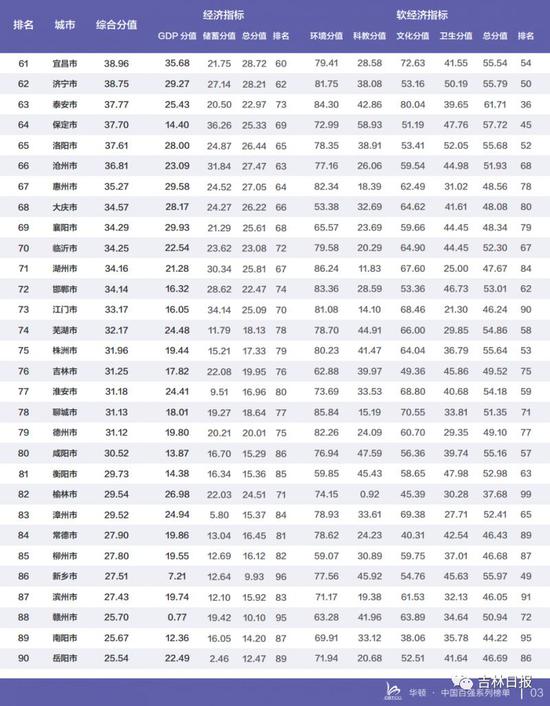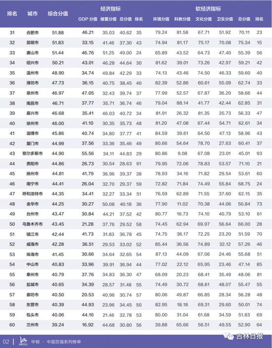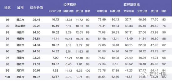 中国百强城市排行榜由华顿经济研究院按照CBT100指标体系编制,以GDP总量排名前100位的地级及以上城市作为入围城市,按照经济指标(占比61.8%)和软经济指标(占比38.2%)综合得分进行排序。经济指标包括GDP和居民储蓄,软经济指标包括环境、科教、文化和卫生。各指标得分按其总量(占比61.8%)和人均量(占比38.2%)综合而成,这也是华顿经济研究院连续第四次发布年度中国百强城市排行榜。