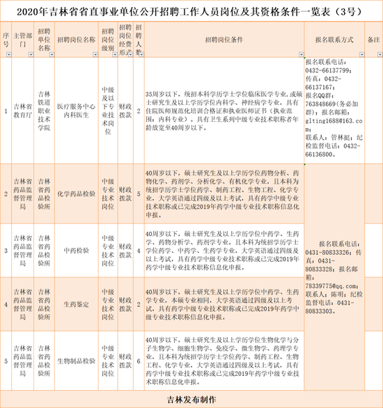 根据《事业单位人事管理条例》《吉林省人民政府办公厅转发关于全面建立和进一步完善全省事业单位新进人员公开招聘制度意见的通知》(吉政办发〔2010〕16号)、吉林省人力资源和社会保障厅《关于印发〈关于进一步完善省直事业单位人员招聘制度的意见〉的通知》(吉人社字〔2009〕35号)精神,吉林省人力资源和社会保障厅会同吉林省教育厅、吉林省药品监督管理局决定,拟面向社会公开招聘工作人员。现将有关事宜公告如下: