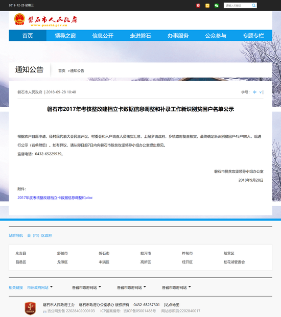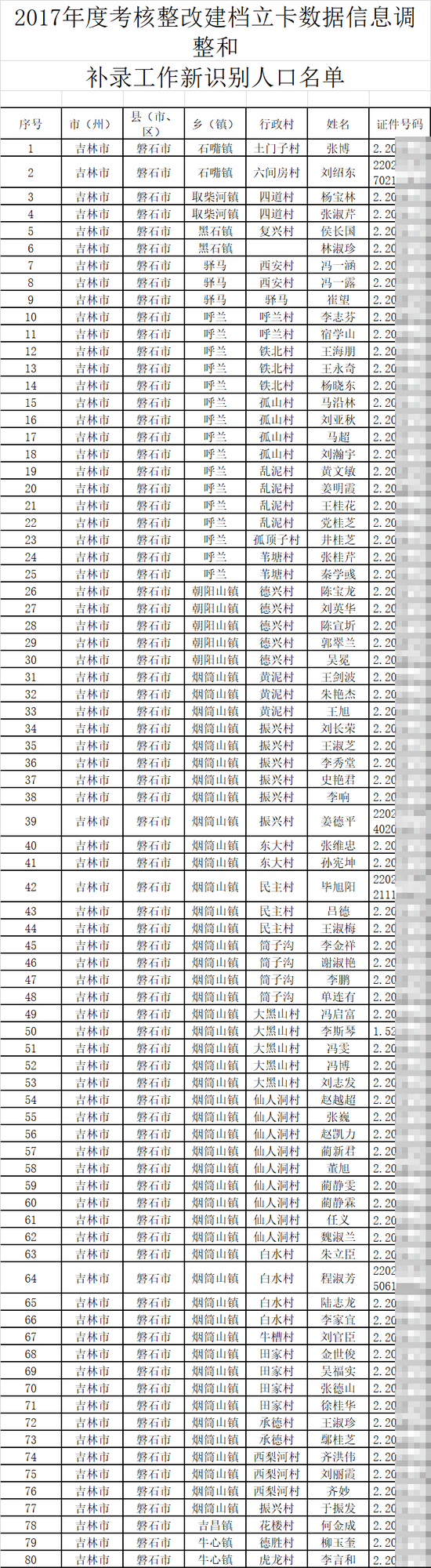 《磐石市2017年考核整改建档立卡数据信息调整和补录工作新识别贫困户名单公示》其中附有一份名单该公示在附件中完整公布了贫困户的姓名及身份证号码,未做任何模糊处理,共涉及80条居民信息,截至记者检索时,相应信息仍在网上对外公布。